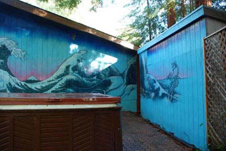 Mural behind studio with hot tub.
